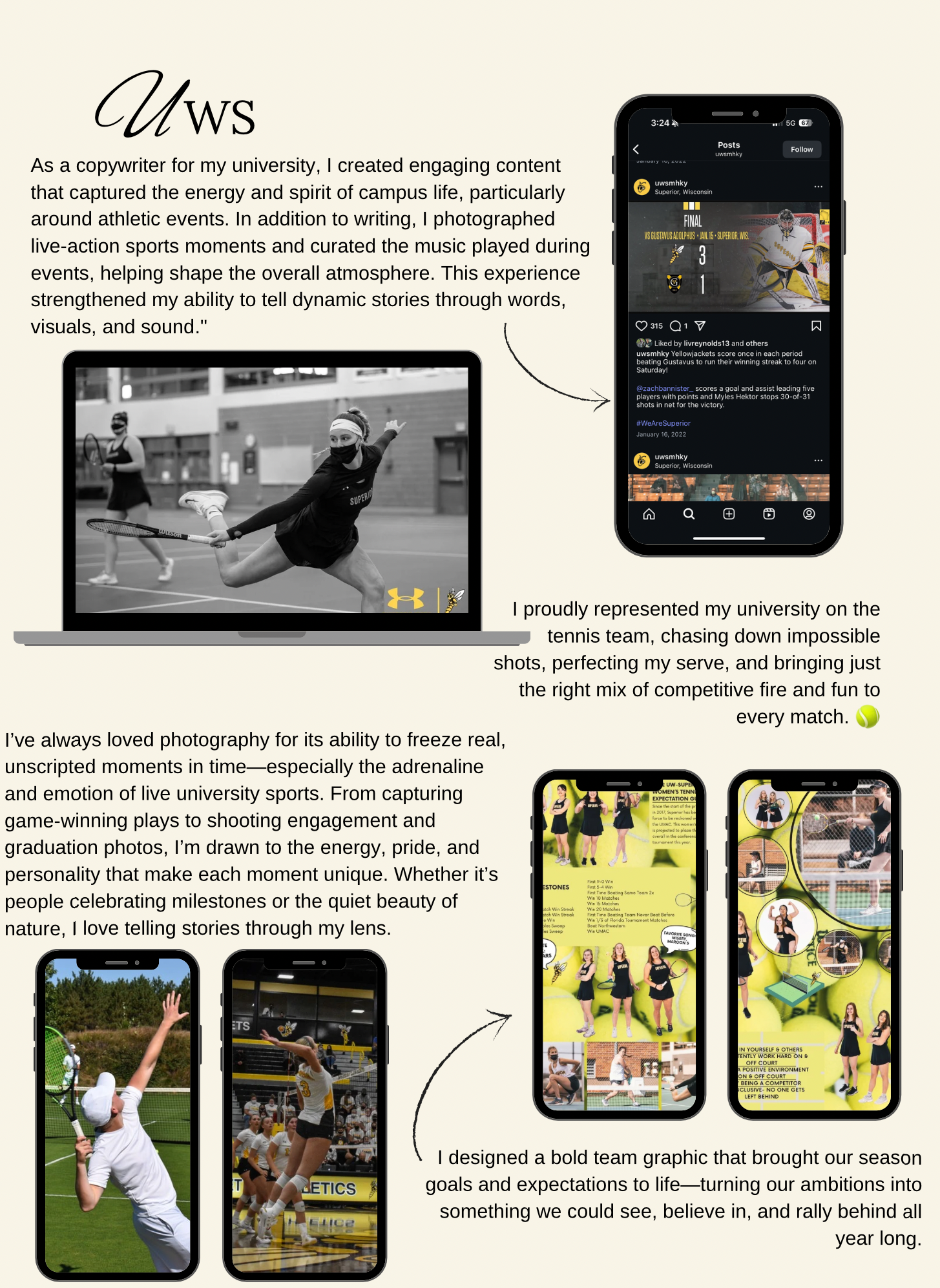 Hi! I’m Kallie, a digital marketer with a passion for content creation, social media growth, and brand strategy. Alongside my full-time role at Fifth Third Bank, I took the initiative to start a marketing internship for a non-profit organization called Mind The Gap. My capstone presentation will include the data & analytics for two social media campaigns: one researching mental health trending topics and creating visual graphics with copywriting captions, the second shooting content around the Charlotte area with copywriting captions. I will also present two mini projects focusing on community engagement and the effectiveness. I also am serving part-time at the Mico Restaurant in the Grand Bohemian Hotel. This allows me to have a fun communication outlet, since I love to chat and meet new people, but also listen and give the best service and recommendations. Outside of work, you'll usually find me in a yoga class, on a tennis court, reading the latest non-fiction romance, or giving my cat, Cheeto, one too many treats (he's just too cute not to). I graduated from the University of Wisconsin-Superior with a degree in Business and Economics, with a marketing concentration. I've always been a creative, eager to find new opportunities to strengthen my skills. During college, I played on the women's tennis team and was an assistant manager at a family-owned gym, which was an experience that solidified my decision to pursue a career in marketing. I assisted the owner in content creation mostly, analyzing data via Meta and running campaigns to drive traffic and growth to the location, website and social media pages. I also created a survey for the customers so we could pinpoint what needed improvement and what our strong suits were to set us apart in the gym market in the Superior/Duluth area. I am always looking to build my skills and apply them to real-world settings, with an eagerness to learn and grow as a professional in my career. cERTIFICATIONS